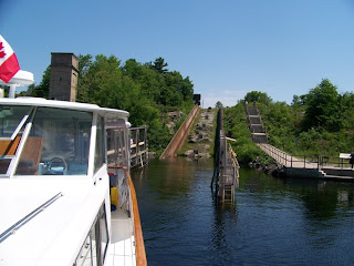 On Monday June 25, we pulled anchor and went the last 4 miles to Lock 44, called "Big Chute". As you can see, this lock is actually a cart that goes up and over, a net drop of 59'. This system was developed to keep the migration of the parasitic sea lamprey from infesting the Lake Simcoe fishery. For you crane guys reading this blog, Hepburn built the cart, ABB built the winch and adjustable frequency control, and Motorola supplied the radio control which operated from the cart. The winch imployes "single failure proof" design. Here's how it works;